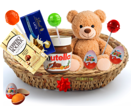 The Tender Hug Basket includes a soft plush teddy bear, a symbol of tenderness, accompanied by a jar of Nutella, two chocolate bars, three lollipops, and three Kinder eggs.