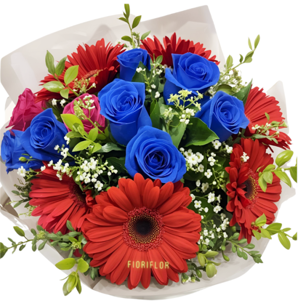 Discover the exclusive bouquet of blue roses, fuchsia roses, and red gerberas — an explosion of vibrant colors and deep meanings, perfect for surprising your loved one with an unforgettable gesture.