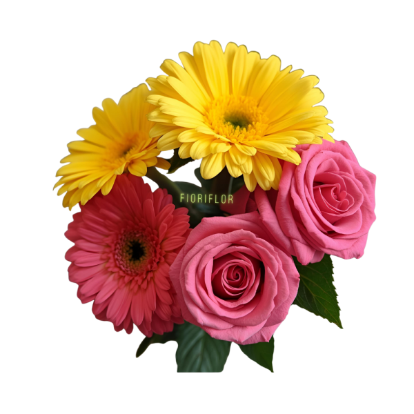 Realizzato con fiori freschi e selezionati, questo bouquet unisce la dolcezza delle rose rosa con la vitalità delle gerbere gialle e la vivacità della gerbera fucsia, creando un equilibrio perfetto tra eleganza e allegria.