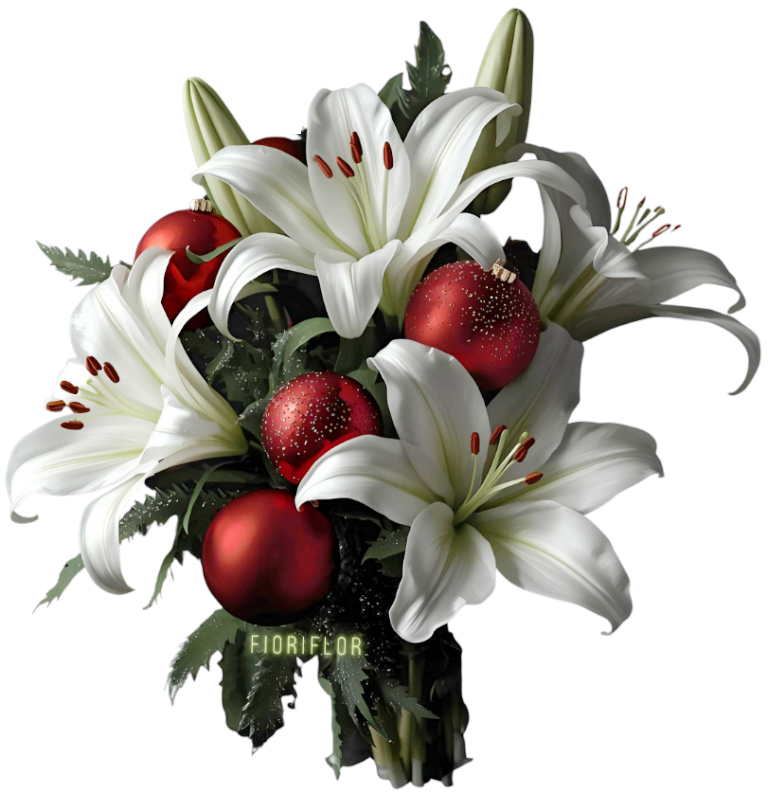 Un bouquet che racchiude tutta la magia delle feste: lilium bianchi dalle linee delicate, simbolo di purezza ed eleganza, impreziositi da palline natalizie rosse che aggiungono un tocco caldo e brillante.